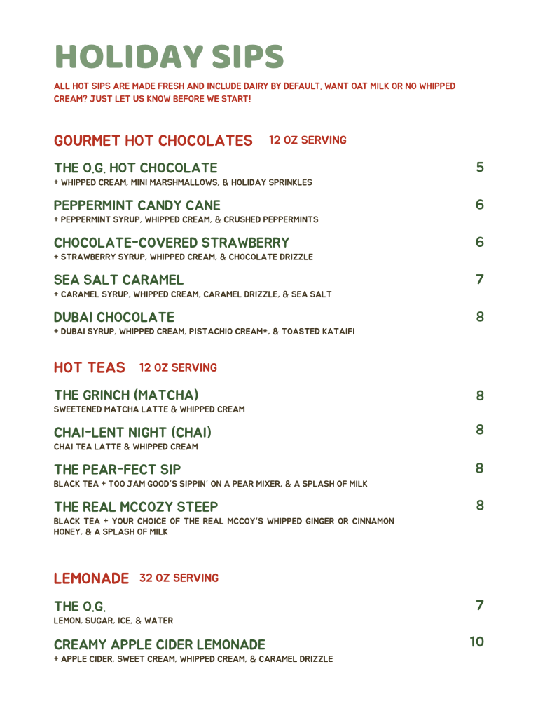 All cold drinks are served in a 32 oz container, and hot sips are served in a 12 oz cup with lid and sleeve.